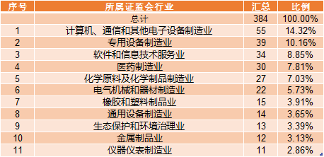 专用设备制造业则涉及新上市公司39家,占比为10.16%。需要指出的是,专用设备制造业也有霸榜的历史,比如2015年和2016年新上市公司数量最多的行业便是专用设备制造业。