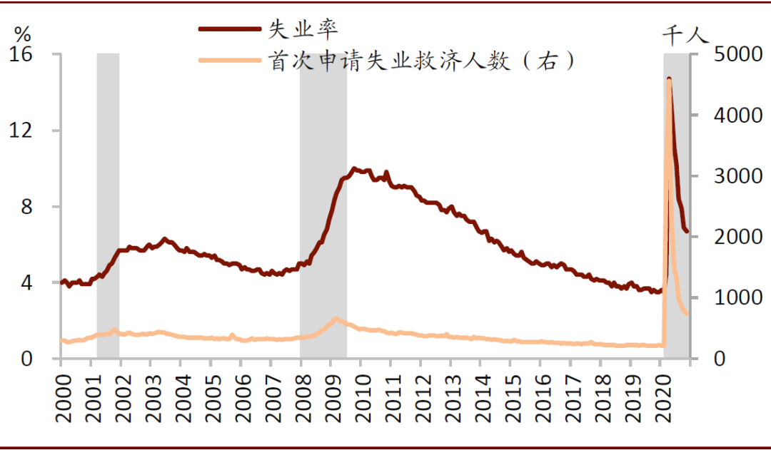 图表:美国失业率与首次申请失业救济人数先升后降