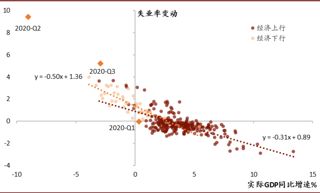 历史经验表明,劳动力市场的恶化往往更快,而复苏则更慢。奥肯定律(Okun‘s law)刻画了产出增速对失业率变化的影响,两者之间存在较为严格的负相关关系。利用美国1949Q1到2020Q3的数据,并按照NBER对美国经济周期的划分,将样本分为经济上行和经济下行两阶段,发现经济下行期增长对失业率的影响显著大于经济上行期,而本次疫情所带来的经济衰退对失业率的影响较以往更大,主要原因在于疫情直接冲击经济的供给端(劳动力市场),大停顿带来了失业率的激增[4]。