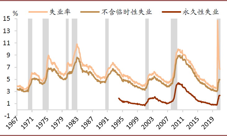 失业率在衰退期的“超前”拐点来自临时性失业。临时性失业是指雇主在确定雇员将在未来被召回的前提下,临时终止雇佣关系(短期停工)。与永久性失业相比,雇主和雇员之间的特定匹配关系并未因失业而消失。疫情期间失业率的拐点是由临时性失业所致。4月疫情爆发后,大封锁导致临时性失业快速冲高,之后随着解封而出现回调。而永久性失业人数仍在持续上升,与此前两轮衰退期走势相同,10月份以来已经超过了临时性失业。在以往的几轮衰退中,永久性失业通常在经济衰退期结束后才能迎来拐点。