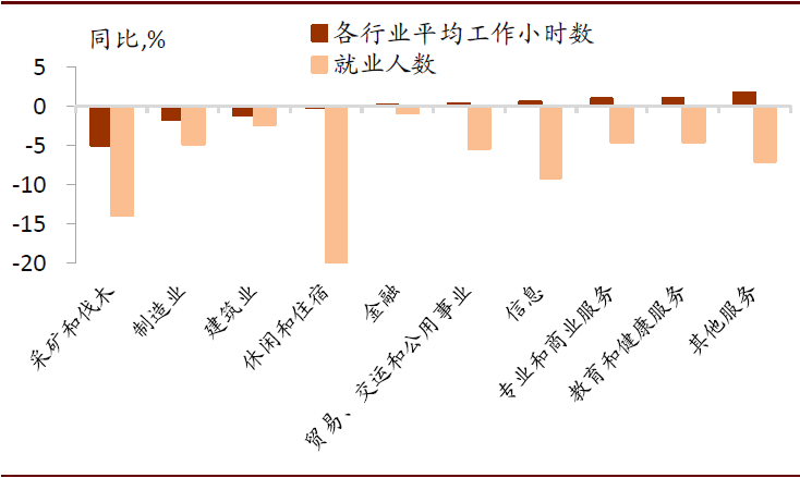 图表: 雇佣人数下降而工作小时数上升的多为服务业
