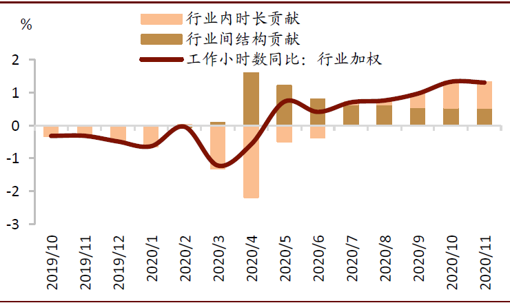 图表:工作小时上升的行业间结构和行业内时长贡献