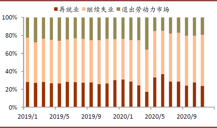 疫情干扰和慷慨就业金,使得美国失业持续时间不断拉长,可能会增大未来重返岗位的难度。失业持续时间的中位数已经从疫情前的9周上升至18周,正在接近2010年的高点。在临时性失业持续时间分布中,小于5周的比例在4月份高达61.9%,随后该占比迅速下降,到11月已降至23.1%,而失业时间大于15周的占比不断升高,从4月的7.7%上升至了11月的54.3%。未来劳动力重返工作岗位的难度或将随着失业持续时间的增加而提高。我们将失业劳动力的流向划分为再就业、继续失业和退出劳动力市场三类,我们发现再就业的进度正在放缓,其占失业人群的比例已经从6月37.0%下降至11月的23.7%,甚至低于2019年的均值(27.6%)。