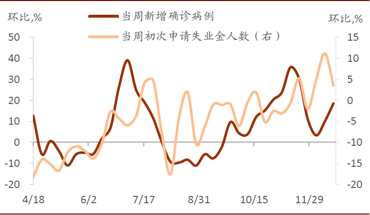 美国第三轮疫情干扰就业市场的修复。当周新增病例的环比增速与首次申请失业金人数的环比变化有一定的相关性,如果第三轮疫情无法在短期内得到有效控制,或将对后续劳动力市场复苏产生不利影响。