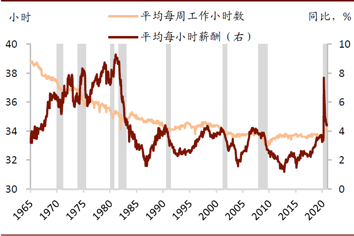 图表:薪酬增速与平均工作小时数均高于疫情前水平