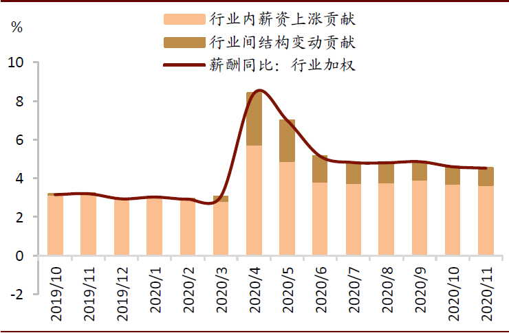 图表: 薪酬增速的行业间结构与行业内薪资上升贡献