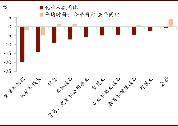 (2)休闲住宿和采矿业薪资增速下降明显,同时就业人数降幅也最大,这两个行业的终端需求不振,进而使得劳动力市场需求萎靡。