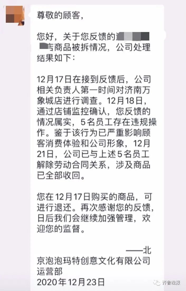 对此泡泡玛特回应已开除5名涉事员工,涉事员工已被全部辞退且永不录用,接下来会对门店服务流程改进,并开展对各地门店的巡视,加强监管。