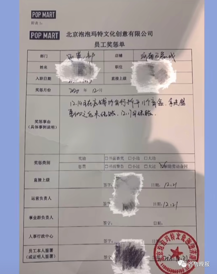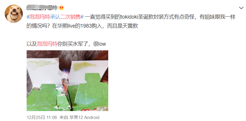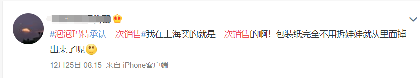 12月23日,有抖音网友发布视频称,在泡泡玛特济南万象城店买到了被拆封的盲盒,质疑店员二次销售,在上面封盒处均有黄色胶水,里面的标签甚至有出现弯曲折痕,很明显有被拆开的痕迹。