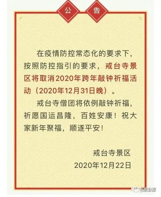 此前,据门头沟区文化和旅游局微信公众号消息,北京戒台寺景区发布公告称,将取消2020年跨年敲钟祝福活动。公告全文如下: