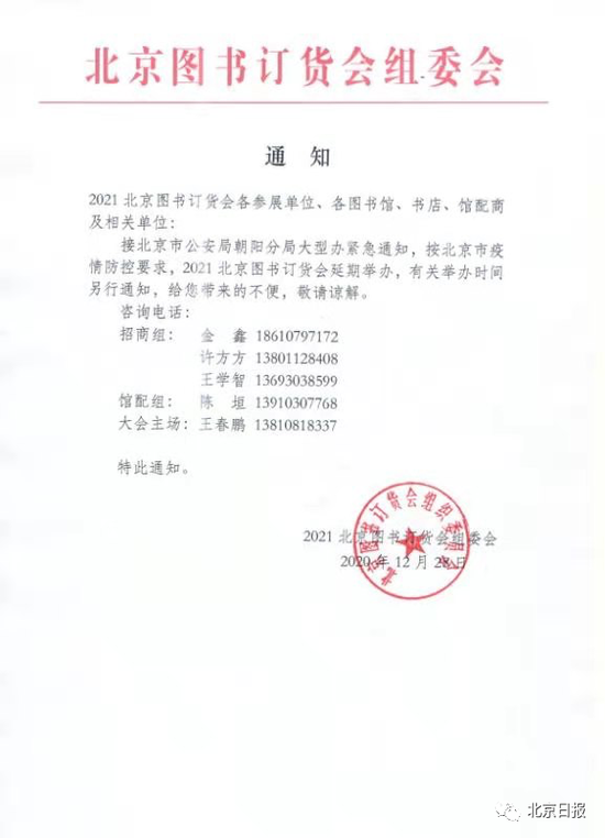 12月28日,2021北京图书订货会组委会发布通知,按北京市疫情防控要求,原订于2021年1月14日举办的2021北京图书订货会延期举办,有关举办时间另行通知。