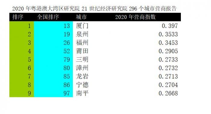 根据2020年12月粤港澳大湾区研究院、21世纪经济研究院发布的296个地级以及地级以上城市营商环境报告,厦门位居福建营商环境第一名,为全国第十三名。泉州营商环境得分为福建第二名,全国第十九名。