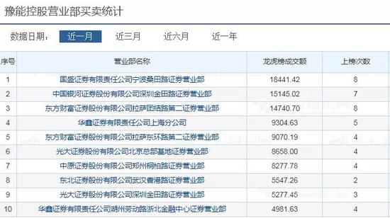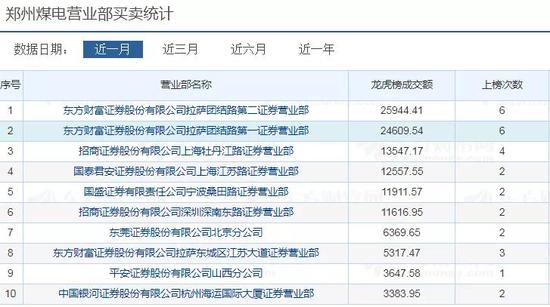 豫能控股、郑州煤电连续大涨,龙虎榜出现不少知名游资席位。豫能控股近一个月成交金额席位排第一和第二的是桑田路和金田路,它们是国盛证券宁波桑田路、银河证券深圳金田路。从郑州煤电近一月的龙虎榜席位成交统计来看,被誉为“散户大本营”东方财富证券拉萨两个营业部位居第一和第二。此外成交金额居前的还有“章盟主”所在的国泰君安上海江苏路、桑田路所在席位。