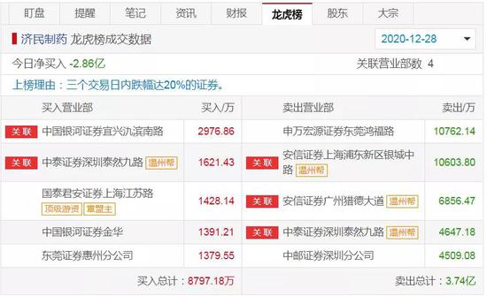 意想不到的是,有资金敢去撬板连续9个跌停的济民制药,不过最终被“埋”了。从盘后龙虎榜来看,“章盟主”所在国泰君安上海江苏路,以及“温州帮”参与撬板。不过卖方出现了三个“温州帮”席位,看来是在割肉了。