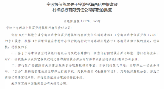 宁波银保监局发布公告称,鉴于宁海中银富登村镇银行有限公司吸收合并宁波宁海西店中银富登村镇银行,同意该行因吸收合并而解散,该行全部业务、财产、债权债务以及其它各项权利义务均由吸收合并后的宁海中银富登村镇银行有限公司承继。同时要求该行应严格按照有关法律法规要求办理解散相关事宜,自收到批复之日起,立即停止一切业务活动,“三会”及高级管理层应立即停止行使职权,向宁波银保监局缴回《金融许可证》,对外做好解散公告。涉及工商登记等法定程序的,该行应当依法办理注销登记手续。同时,同意宁海中银富登村镇银行有限公司西店支行开业。