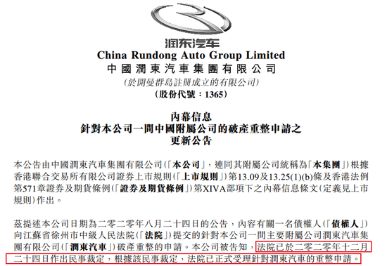 此前润东汽车发布公告,就有关一名债权人向江苏省徐州市中级人民法院提交的针对该公司一间主要附属公司润东汽车集团有限公司破产重整的申请。