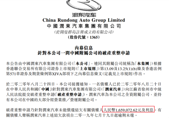 此番润东汽车集团破产重整申请则是针对其未能偿还结欠有关债权人165.9万元及利息,有关债权人声称润东汽车集团上述结欠款项自2019年7月19日起逾期未还。