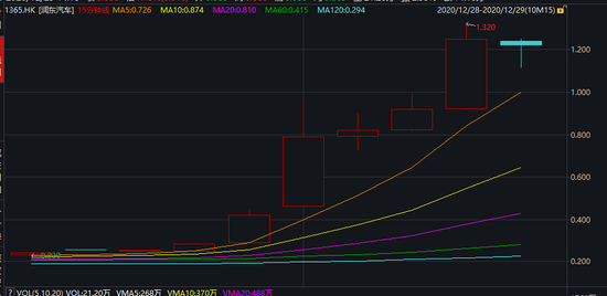 12月29日,港股润东汽车盘中一度大涨214%,股价最高站上1.32港元。