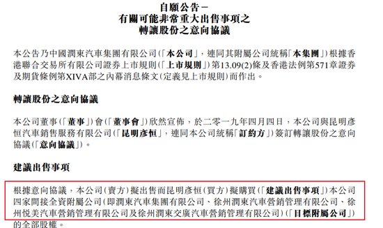 2019年4月,润东汽车公告拟以34亿元的交易对价向昆明彦恒出售润东汽车集团有限公司、徐州润东汽车营销管理有限公司、徐州悦美汽车营销管理有限公司及徐州润东交广汽车营销管理有限公司这四家全资子公司100%股权。与此同时,润东2019年财报显示,截至2019年底,润东汽车已抵押集团资产8.94亿元。