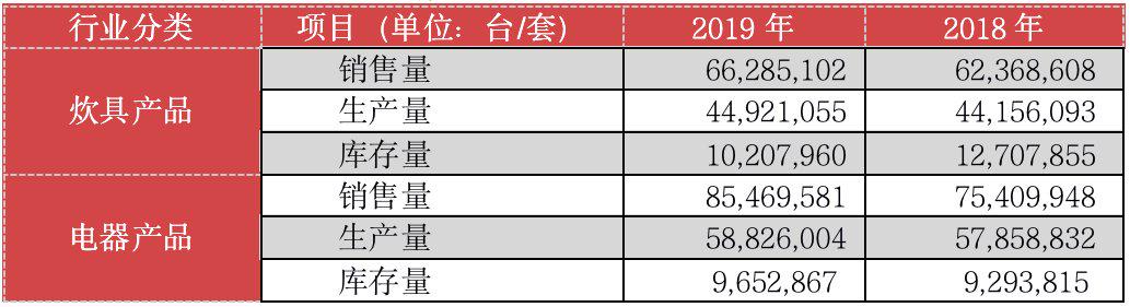 同时,《投资时报》研究员查阅年报注意到,2019年苏泊尔炊具产品的销售量、生产量分别是6628.51万台、4492.11万台;电器产品的销售量、生产量分别是8546.96万台、5882.60万台。对应上述各产品,2018年度的库存量分别为1270.79万台和929.38万台。