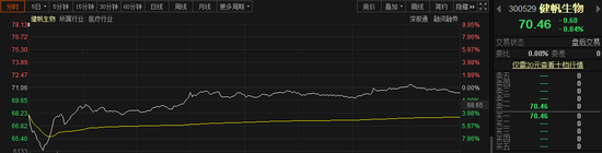 开盘后,健帆生物大幅低开,随后迅速杀跌,一度跌至10%,尾盘时已拉回跌幅。其今日收报70.46元略跌,换手率达3.15%。日内主力资金大规模流入4亿元,流出4.19亿元。