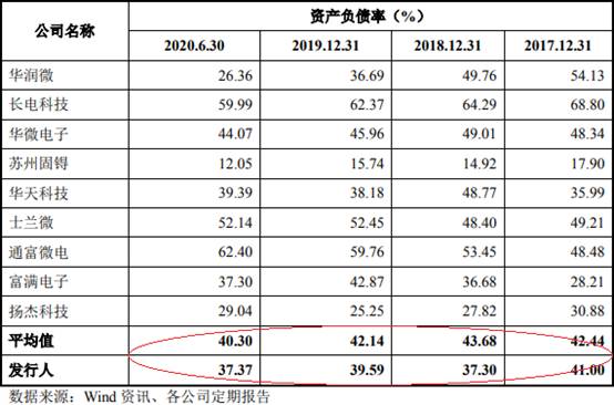 2017年至2020年1-6月,蓝箭电子资产负债率分别为41.00%、37.30%、39.59%、37.37%,同行业可比上市公司均值分别为42.44%、43.68%、42.14%、40.30%。