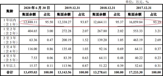 2017年至2020年1-6月,蓝箭电子1年以内(含1年)应收账款余额分别为1.61亿元、1.27亿元、1.23亿元、1.29亿元,占比分别为93.19%、95.37%、93.87%、95.50%。