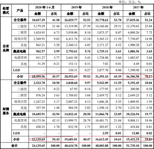 2017年至2020年1-6月,蓝箭电子自有品牌产品毛利率分别为10.90%、7.79%、15.51%、12.55%。蓝箭电子自有品牌主要产品为分立器件产品中的三极管、二极管、场效应管。
