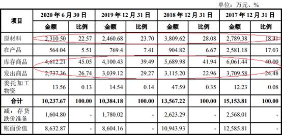 2017年至2020年1-6月,蓝箭电子存货中原材料分别为2789.38万元、3809.62万元、2460.68万元、2310.50万元,占比分别为18.41%、28.08%、23.70%、22.57%;库存商品分别为6061.44万元、5689.98万元、4100.43万元、4612.21万元,占比分别为40.00%、41.94%、39.49%、45.05%;发出商品分别为3709.58万元、3115.20万元、3039.12万元、2737.36万元,占比分别为24.48%、22.96%、29.27%、26.74%。