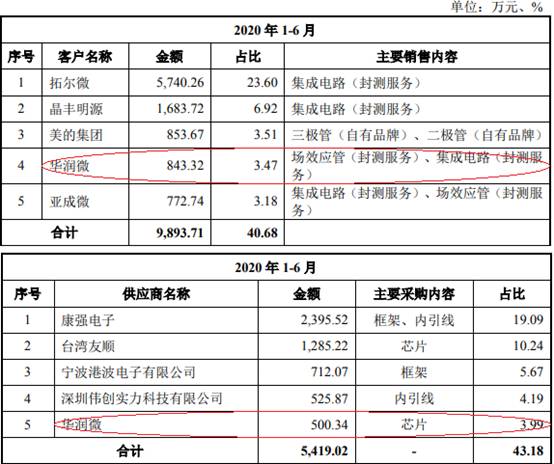 蓝箭电子2020年1-6月前五大客户之一同时为公司前五大供应商之一。蓝箭电子2020年上半年第四大客户为华润微,同期,华润微为公司第五大供应商。2020年上半年,蓝箭电子对华润微销售金额为843.32万元,主要销售内容为场效应管(封测服务)、集成电路(封测服务);同期,蓝箭电子向华润微采购金额为500.34万元,主要采购内容为芯片。