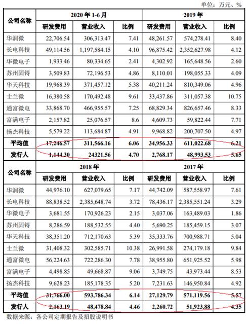 2017年至2020年1-6月,蓝箭电子同行业可比上市公司研发费用率均值分别为5.57%、6.14%、6.21%、6.06%。