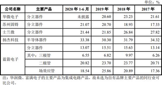 2017年至2020年1-6月,蓝箭电子分立器件毛利率分别为13.14%、15.63%、15.51%、13.07%,同行业可比公司苏州固锝分立器件毛利率分别为17.33%、18.93%、20.70%、21.07%,士兰微分立器件毛利率分别为27.82%、26.84%、21.85%、21.44%,扬杰科技半导体器件毛利率分别为34.32%、31.79%、30.30%、33.38%, 2017年至2019年,同行业可比公司华微电子分立器件毛利率分别为21.61%、23.23%、20.60%。