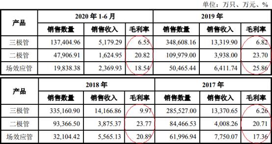 2017年至2020年1-6月,蓝箭电子三极管毛利率分别为6.26%、9.97%、6.82%、6.55%,二极管毛利率分别为20.71%、23.77%、23.70%、20.82%,场效应管毛利率分别为17.36%、20.89%、25.86%、18.54%。