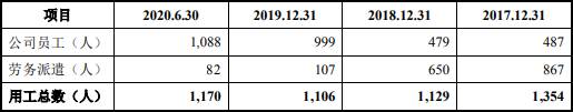 2017年至2020年1-6月,蓝箭电子用工总数分别为1354人、1129人、1106人、1170人,其中,公司员工分别为487人、479人、999人、1088人,劳务派遣分别为867人、650人、107人、82人。
