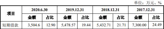 2017年至2020年1-6月,蓝箭电子短期借款分别为7300.00万元、5432.71万元、5478.57万元、3504.60万元,占流动负债比例分别为24.49%、21.71%、19.44%、12.90%。