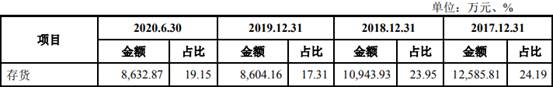 2017年至2020年1-6月,蓝箭电子存货账面价值分别为1.26亿元、1.09亿元、8604.16万元、8632.87万元,占流动资产比例分别为24.19%、23.95%、17.31%、19.15%。