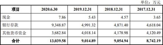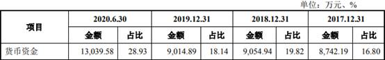 2017年至2020年1-6月,蓝箭电子货币资金分别为8742.19万元、9054.94万元、9014.89万元、1.30亿元,占流动资产比例分别为16.80%、19.82%、18.14%、28.93%。