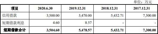 2017年至2020年1-6月,蓝箭电子短期借款中信用借款分别为7300.00万元、5432.71万元、5470.00万元、3500.00万元。