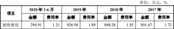 2017年至2020年1-6月,蓝箭电子销售费用分别为891.67万元、898.28万元、926.98万元、294.91万元,占营业收入比重分别为1.72%、1.85%、1.89%、1.21%。