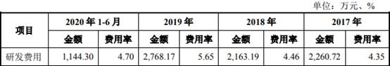 2017年至2020年1-6月,蓝箭电子研发费用分别为2260.72万元、2163.19万元、2768.17万元、1144.30万元,占营业收入比重分别为4.35%、4.46%、5.65%、4.70%。