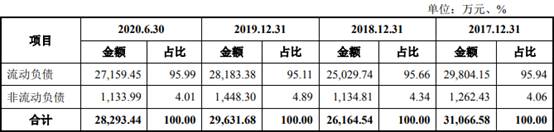 2017年至2020年1-6月,蓝箭电子负债合计分别为3.11亿元、2.62亿元、2.96亿元、2.83亿元,其中,流动负债分别为2.98亿元、2.50亿元、2.82亿元、2.72亿元,非流动负债分别为1262.43万元、1134.81万元、1448.30万元、1133.99万元。