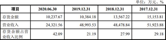 2017年至2020年1-6月,蓝箭电子存货余额分别为1.52亿元、1.36亿元、1.04亿元、1.02亿元,占营业收入比例分别为29.18%、27.99%、21.19%、42.09%。