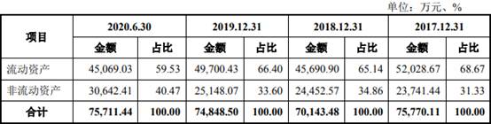 2017年至2020年1-6月,蓝箭电子资产总额分别为7.58亿元、7.01亿元、7.48亿元、7.57亿元,其中,流动资产分别为5.20亿元、4.57亿元、4.97亿元、4.51亿元,非流动资产分别为2.37亿元、2.45亿元、2.51亿元、3.06亿元。