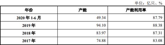 数据显示,2017年至2020年1-6月,蓝箭电子产能分别为74.88亿只、83.97亿只、94.10亿只、49.34亿只,产能利用率分别为83.08%、87.31%、88.38%、87.79%。