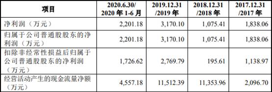 2017年至2020年1-6月,蓝箭电子净利润分别为1838.06万元、1075.41万元、3170.10万元、2201.18万元,归属于公司普通股股东的净利润分别为1838.06万元、1075.41万元、3170.10万元、2201.18万元,经营活动产生的现金流量净额分别为2096.70万元、1.14亿元、1.15亿元、4557.18万元。