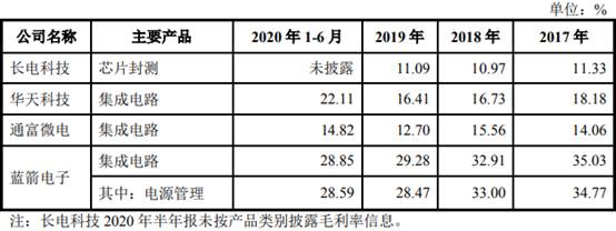 2017年至2020年1-6月,蓝箭电子同行业可比公司华天科技集成电路产品毛利率分别为18.18%、16.73%、16.41%、22.11%,通富微电集成电路产品毛利率分别为14.06%、15.56%、12.70%、14.82%,2017年至2019年,长电科技芯片封测毛利率分别为11.33%、10.97%、11.09%。
