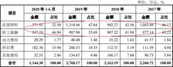 2017年至2020年1-6月,蓝箭电子研发费用中直接材料分别为1043.69万元、942.27万元、1318.66万元、371.93万元,占比分别为46.17%、43.56%、47.64%、32.50%;职工薪酬分别为977.14万元、907.22万元、987.90万元、537.18万元,占比分别为43.22%、41.94%、35.69%、46.94%。