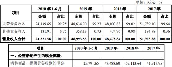 2017年至2020年1-6月,蓝箭电子营业收入分别为5.19亿元、4.85亿元、4.90亿元、2.43亿元,主营业务收入分别为5.17亿元、4.80亿元、4.86亿元、2.41亿元,销售商品、提供劳务收到的现金分别为4.19亿元、5.31亿元、4.75亿元、2.58亿元。