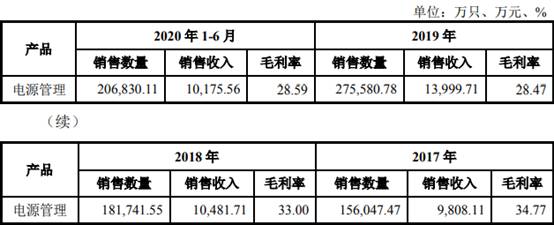 2017年至2020年1-6月,蓝箭电子电源管理毛利率分别为34.77%、33.00%、28.47%、28.59%。