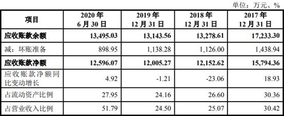 2017年至2020年1-6月,蓝箭电子应收账款净额分别为1.58亿元、1.22亿元、1.20亿元、1.26亿元,占流动资产比例分别为30.36%、26.60%、24.16%、27.95%;占营业收入比例分别为30.42%、25.07%、24.50%、51.79%。
